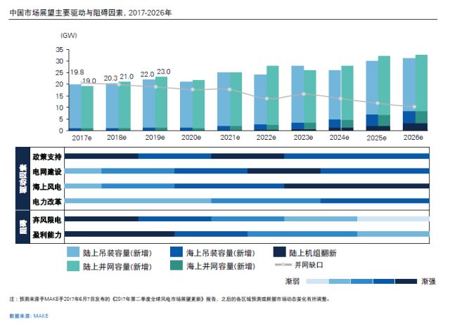 風(fēng)電并網(wǎng)缺口逐年減少,預(yù)計(jì)將從2017年的20.3GW縮減到2026年的10.1GW。 2020年以后,海上風(fēng)電將進(jìn)入快速發(fā)展期,并于2026年達(dá)到當(dāng)年新增并網(wǎng)容量的16.0%。風(fēng)電機(jī)組翻新市場(chǎng)將成為未來(lái)風(fēng)電發(fā)展重心之一。